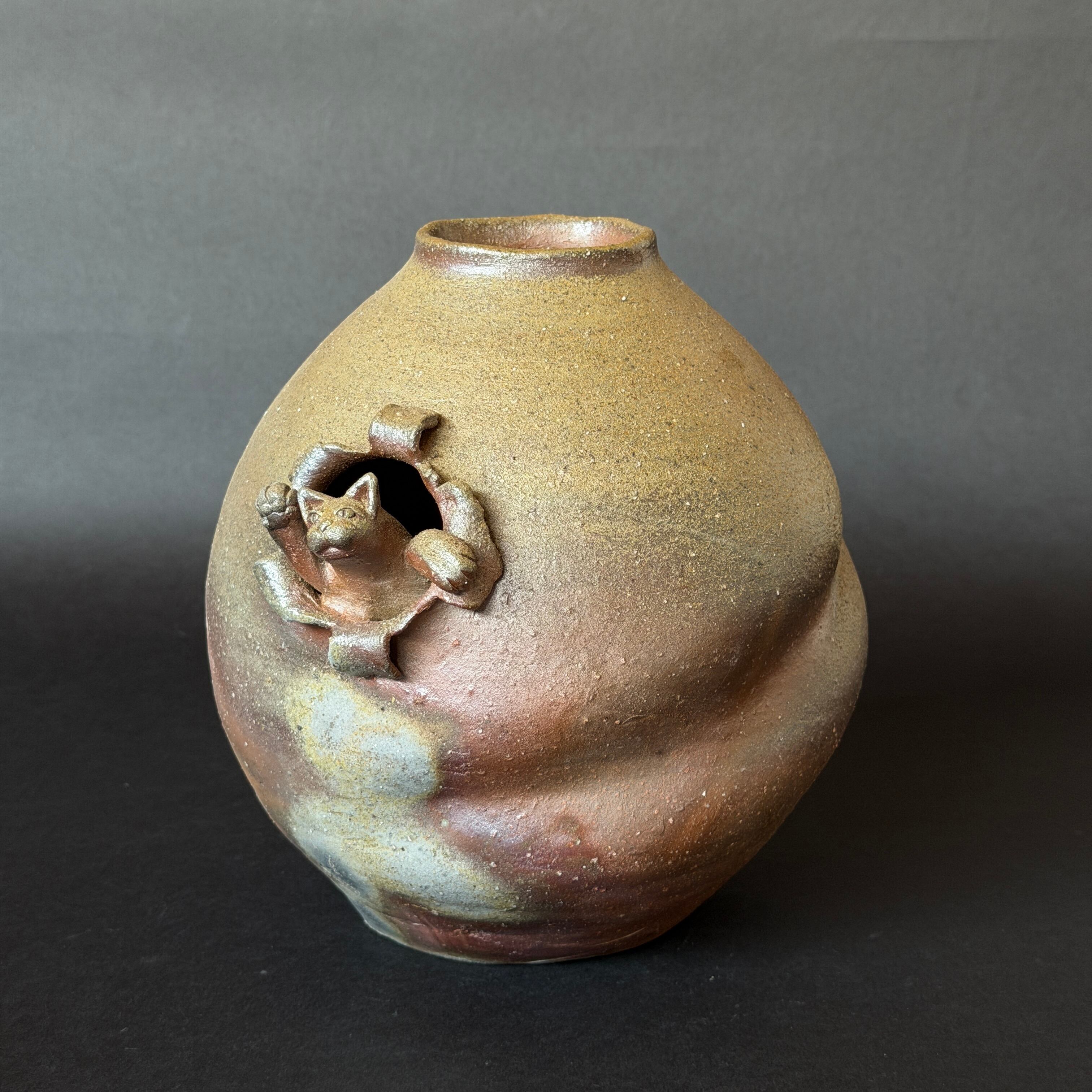 「スーパーにゃん花生」は、備前焼で作られたユニークな花器です。スーパーマンのように勢いよく飛び出してきたスーパーにゃんのデザインが特徴的で、上からはもちろん、猫が飛び出してできた穴からも花を生けることができます。遊び心あふれるデザインが、あなたのインテリアに楽しいアクセントを加えます!